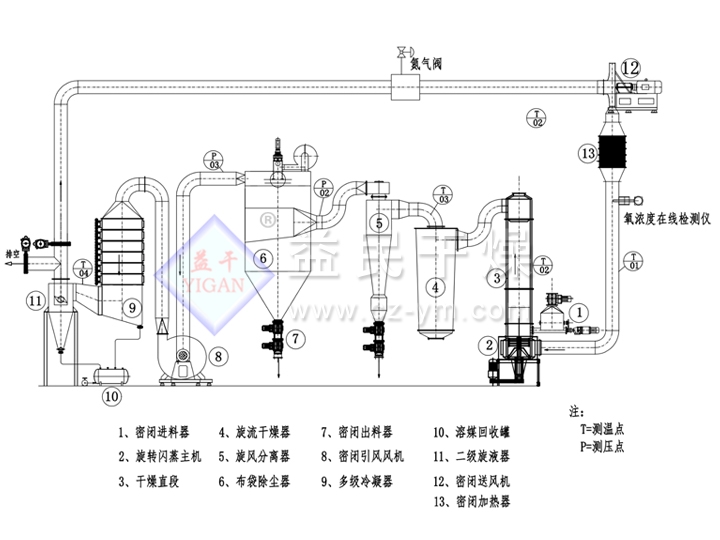 系统在使用前,使用氮气将系统内的空气置换出,使系统内的氧气含量达到溶媒的安全浓度之内。循环氮气经加热设备被加热后进入闪蒸干燥机。湿物料由输送装置进入闪蒸干燥机的螺旋加料机构,螺旋加料器可变频调速。物料经螺旋输送进入干燥破碎室,随即被高速旋转而又具有不同角度的刀片破碎,又被高速进入旋流干燥室的高温气流冲击高速旋转、夹带上升,这时气流温度急速下降,物料中水分迅速蒸发从而完成干燥过程。过大物料被淘析环挡住落到干燥破碎室继续破碎直到获得细粉料。