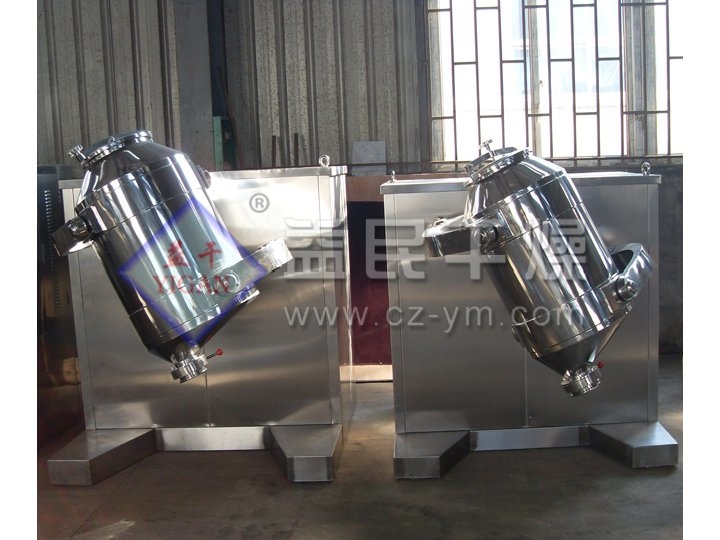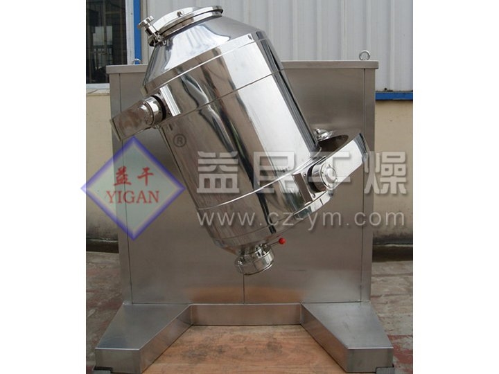 混合料桶,通过二只Y型万向节悬装于主、从动轴端部,二只万向节在空间既交叉又互相垂直。当主动轴被拖动旋转时,万向节使料桶在空间周而复始地作平移、转动和翻滚等复合运动。物料则在筒体内跟着作轴向、径向和环向的三维复合运动。筒内的多种物料相互流动、扩散、掺杂,^后呈均匀状态。