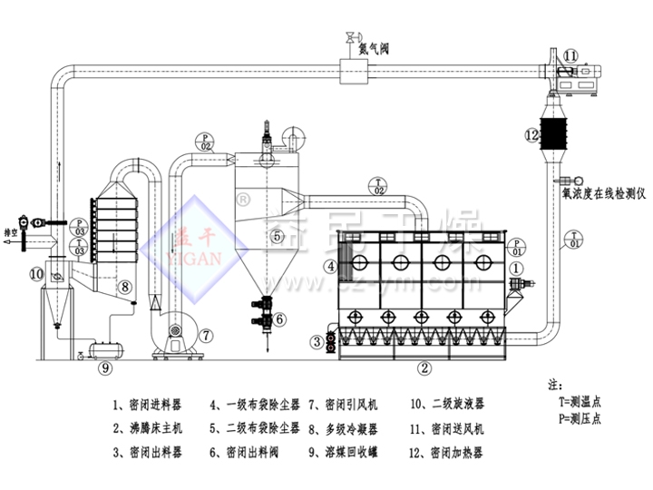 1、 系统全封闭,基本无氧气(含量自控)。如上所述,闭路循环沸腾干燥机的系统处于全封闭状态作业,既没有向外泄露,也没有向内泄露。为此必须做到系统的所有部位,无论是管道接口,还是箱体的进出风口;无论是在正压区还是负压区,无论是静态零件还是动态零件,都必须严格密封。系统内氧气含量不超过工艺要求,确保了防爆防燃的安全性,也对惧氧物料提供可靠保证。