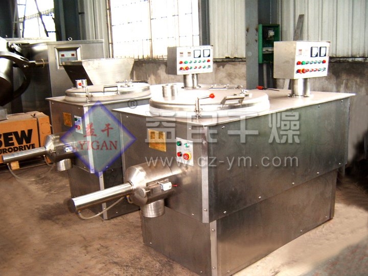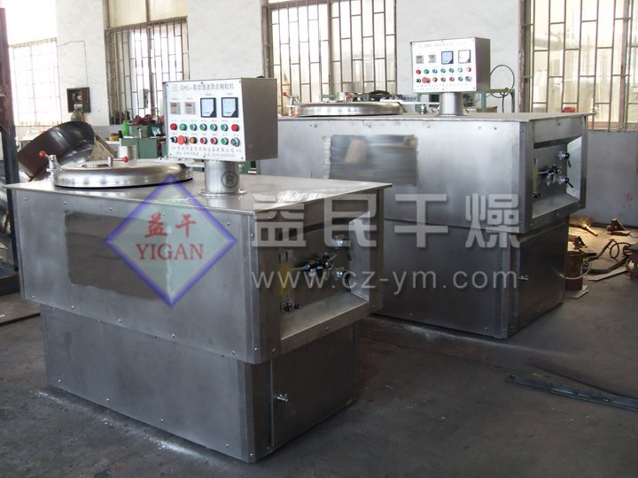 粉体物料与粘合剂在园筒形容器中由底部混合桨充分混合成湿润软材,然后由侧置的高速粉碎桨切割均匀的湿颗粒。